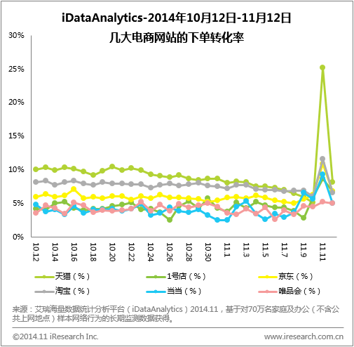 10月12日-11月12日期間,從幾大主流電商的下單轉(zhuǎn)化率可以看到:10月份天貓的轉(zhuǎn)化率普遍在9%-10%之間,但從10月末為“雙十一”蓄勢(shì)開始,用戶便開始積攢需求,等待“雙十一”當(dāng)天下單,天貓轉(zhuǎn)化率跌至9%以下,之后一路下滑,到11月10日,降到最低點(diǎn)5.1%。到11月11日,所有需求開始爆發(fā),轉(zhuǎn)化率驟增至25.1%,相當(dāng)于每四個(gè)訪問天貓的人中,就有一人下單。反觀淘寶、1號(hào)店、京東,則是“雙十一”前期呈小幅下降趨勢(shì),大促當(dāng)天轉(zhuǎn)化率提升明顯,環(huán)比11月10日的增幅分別為91%、45%、74%。
