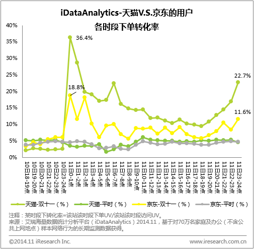 “雙十一”的熱鬧和酣戰(zhàn)過后,參與“血拼”讓利的各電商都收獲了相當(dāng)?shù)牧髁?,然而究竟轉(zhuǎn)化幾何,才是流量背后的真相。艾瑞咨詢iResearch基于網(wǎng)民連續(xù)用戶行為推出的海量數(shù)據(jù)分析服務(wù)iDataAnalytics-電商版,經(jīng)過深度挖掘數(shù)據(jù)顯示:2014年“雙十一”,天貓下單用戶占比超過25%,而0-2點(diǎn)的秒殺用戶轉(zhuǎn)化更佳。