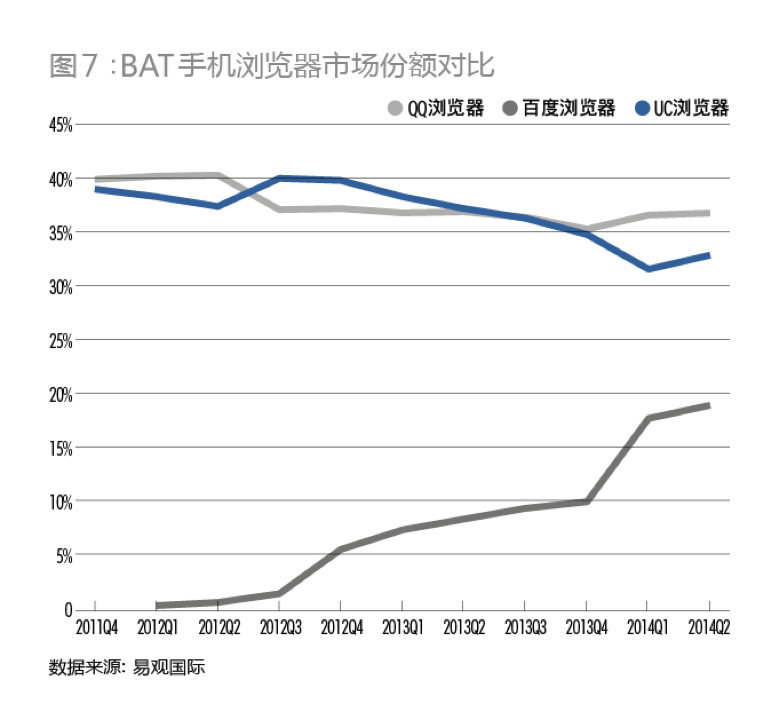 而累計(jì)用戶數(shù)量方面,截至2014年第二季度,QQ瀏覽器以38.5%的份額大大高于UC瀏覽器25.8%的份額。